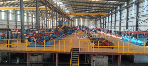 原礦經(jīng)過三段一閉路破碎系統(tǒng),采用一段閉路磨礦流程,磨礦細(xì)度為-100目占62%,經(jīng)過一次粗選一次掃選,粗精礦濃縮脫水后再磨,磨后精礦進(jìn)行三磨四選后進(jìn)行濕式篩分,正目石墨經(jīng)過一磨兩選后進(jìn)入壓濾烘干系統(tǒng),正目產(chǎn)品進(jìn)行分目包裝,篩分負(fù)目經(jīng)過一次濃縮浮選,再進(jìn)行三磨四選,進(jìn)入壓濾烘干包裝系統(tǒng),尾礦濕排至尾礦庫。