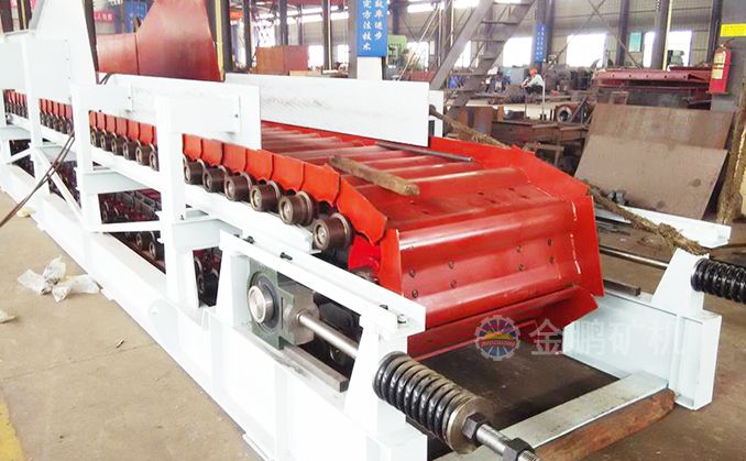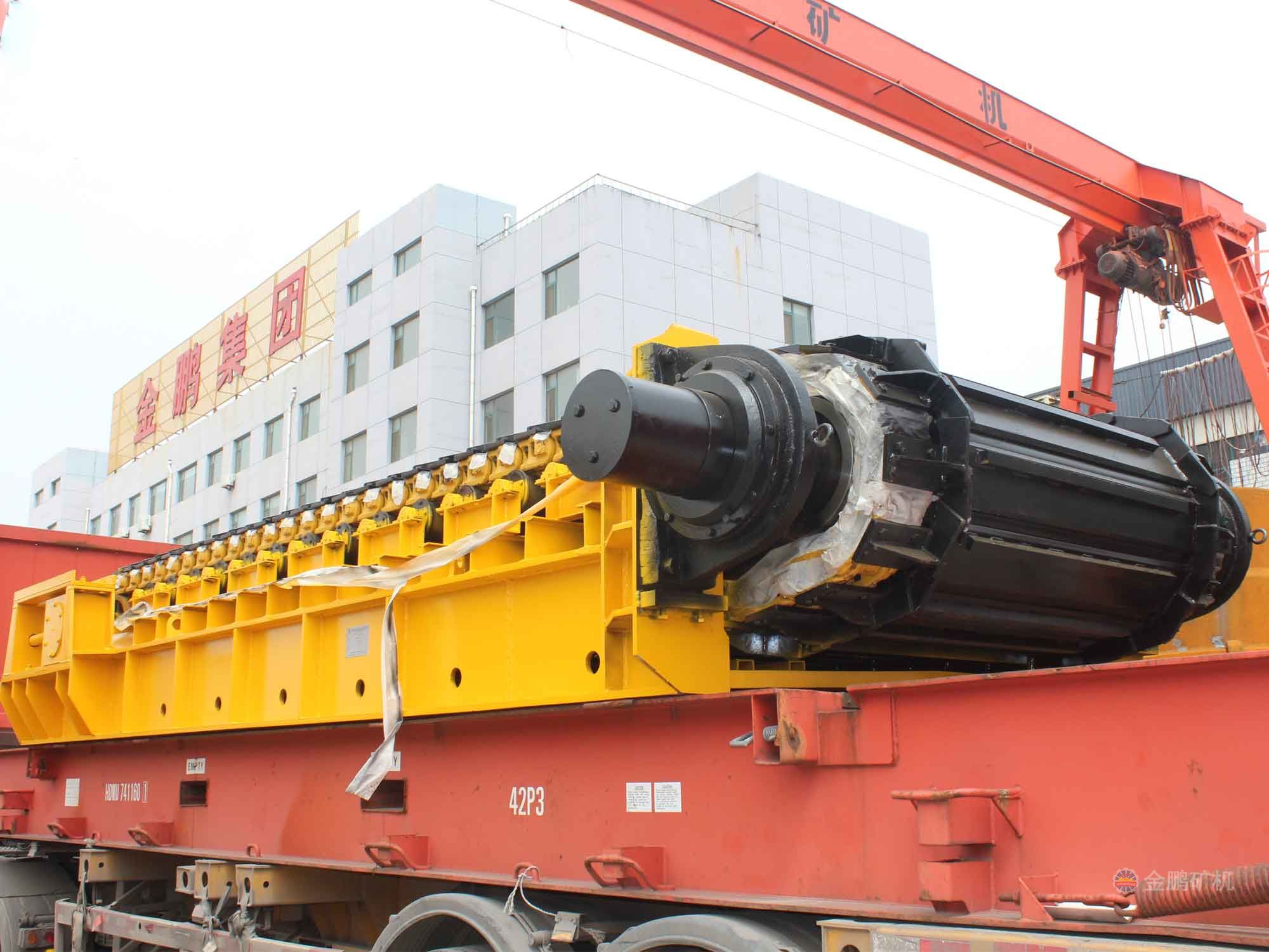 采用節距為200mm的高強度模鍛鏈條為牽引件,兩根鏈條繞過安裝在機體頭部的一對驅動鏈輪和機體尾部的一對張緊輪聯成封閉形回路,在兩排鏈條的每個鏈節上裝配了相互交迭的、重型結構的輸送槽而成為一個連續的能夠運載物料的輸送線路。其自重和物料的重量由安裝在機體上的多排支重輪、鏈托輪和滑道梁支承。傳動系統經交流變頻調速電動機聯接減速機,再由漲套與驅動裝置直聯驅動運載機構低速運行。將尾部料倉卸入的物料沿輸送線路運至機體的前方排出,實現向下方的工作機械連續均勻喂料的目的。
