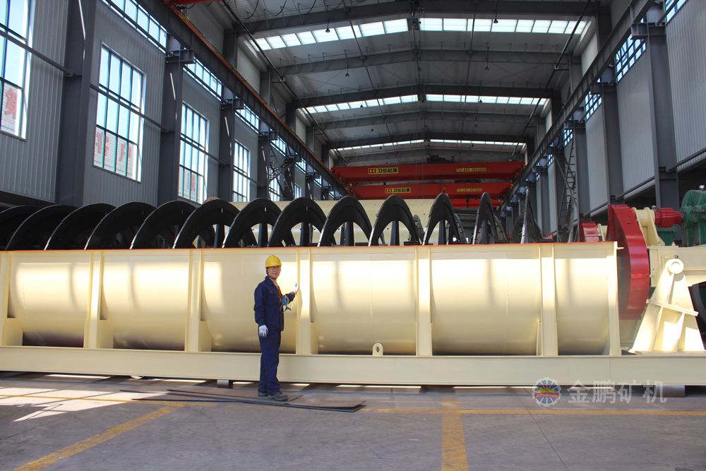 高堰式螺旋分級機(jī)采用將磨細(xì)后的礦漿從位于沉降區(qū)中部的進(jìn)料口給入水槽,傾斜安裝的水槽下面是礦漿分級沉降區(qū),螺旋低速轉(zhuǎn)動,對礦漿起攪拌作用,使細(xì)顆粒懸浮到上面,流到溢流堰處溢出。粗顆粒沉到槽底,由螺旋輸送到排料口作為返砂排出。溢流堰的位置高于螺旋軸下端的軸承中心,低于溢流端螺旋上緣。