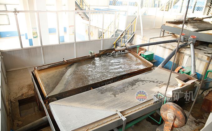 礦粒群從6s搖床床面上角的給礦槽送入,同時由給水槽供給橫向沖洗水,于是礦粒在重力,橫向流水沖力,床面作往復不對稱運動所產生的慣性和摩擦力的作用下,按比重和粒度分層,并沿床面作縱向運動和沿傾斜床面作橫向運動。比重和粒度不同的礦粒沿著各自的運動方向逐漸扇形流下,分別從搖床精礦端和尾礦側的不同區排出,最后被分成精礦,中礦和尾礦。